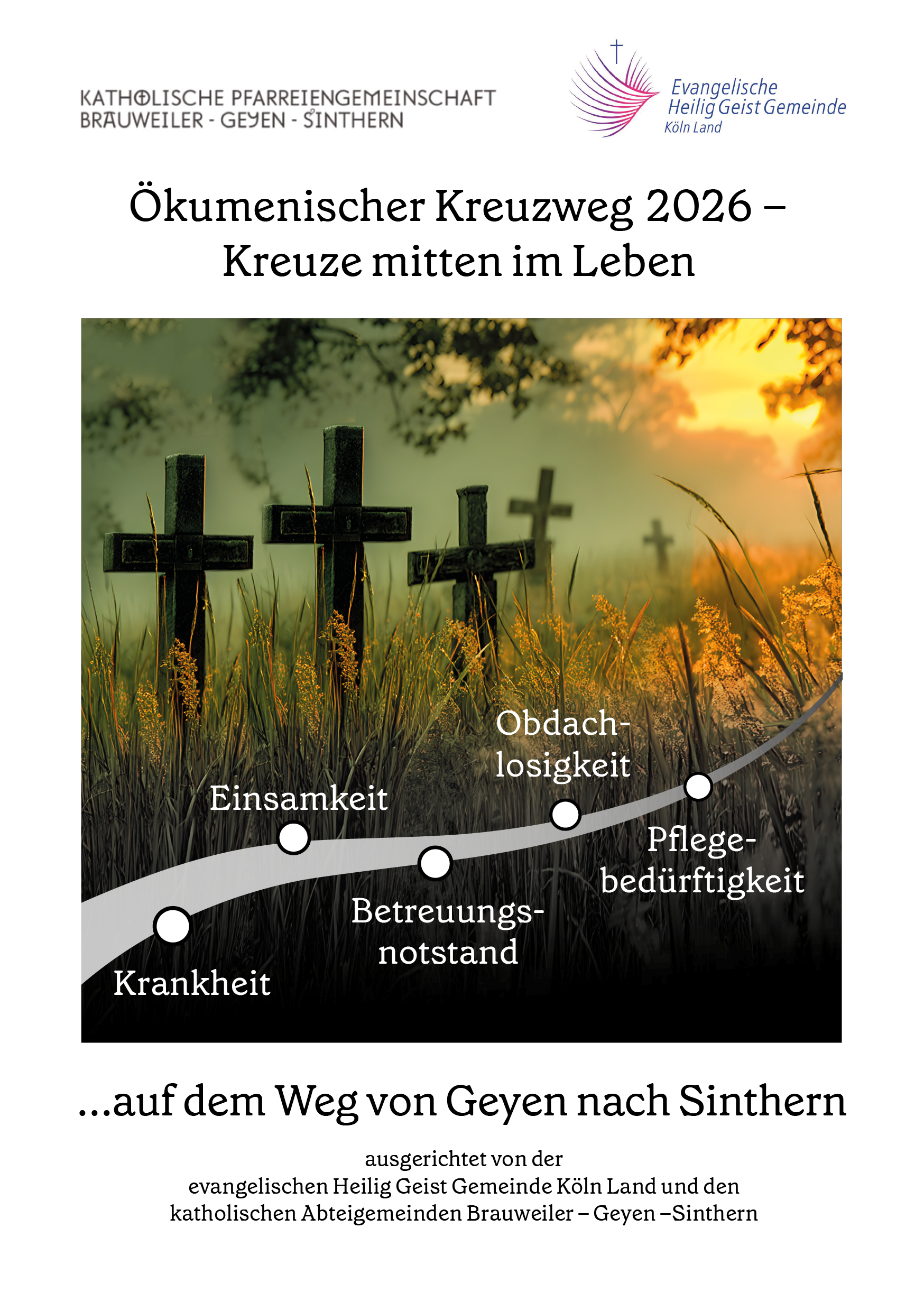 Kreuze mitten im Leben – auf dem Weg von Geyen nach Sinthern Karfreitag, 3. April 2026 Start: 12:00 Uhr St. Cornelius, von-Harff-Str.4, Geyen Ziel: ca